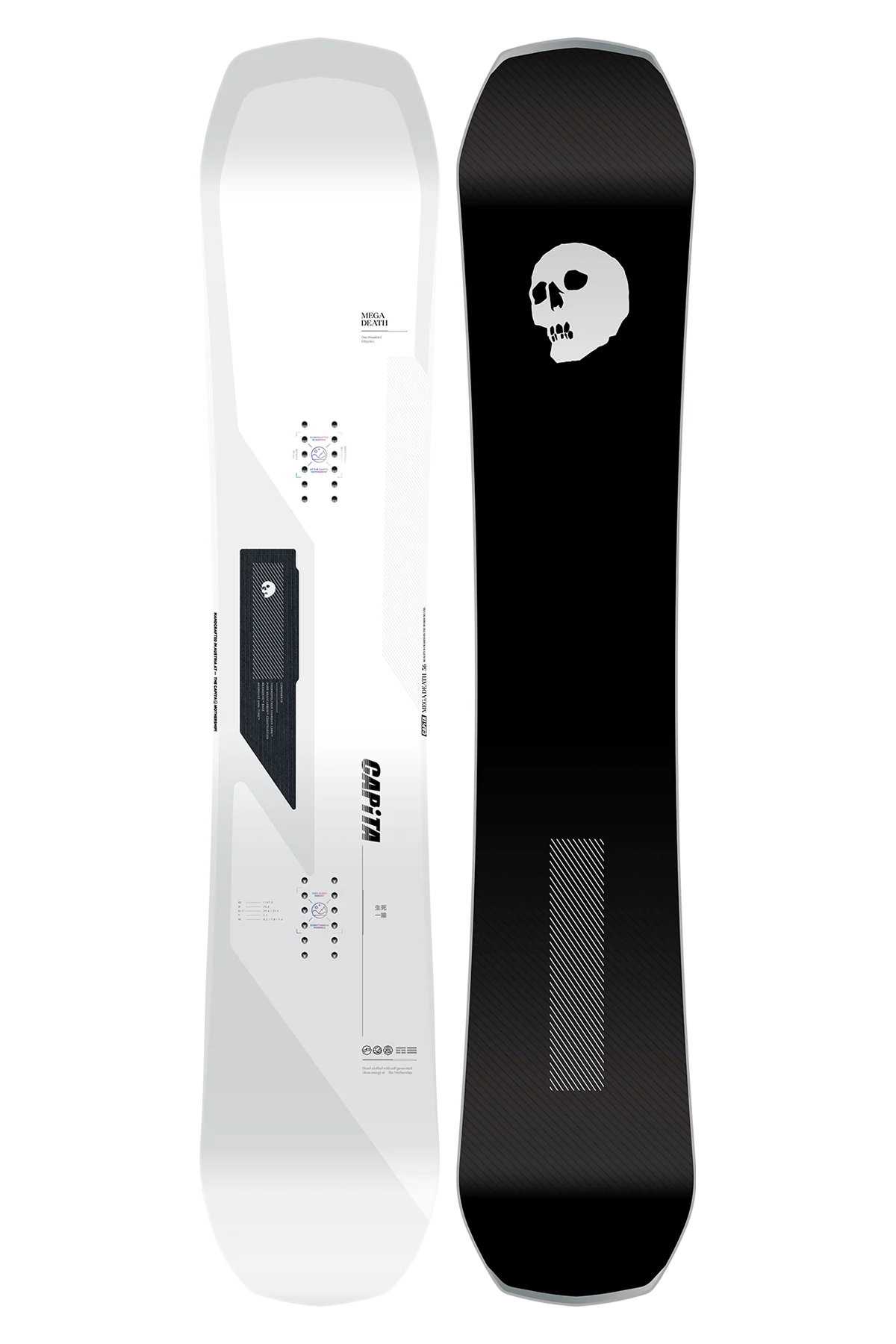 Inspired by the legacy of the Black Snowboard of Death, yet custom designed for an unmatched ultralight and powerful performing ride, we present the MEGA DEATH—a high-end, high-tech freeride machine unlike anything else. Fully loaded with construction technology and design philosophy developed at the world’s most advanced manufacturing facility, THE CAPiTA MOTHERSHIP, this featherlight construction comes from a Thermopolymer Starship Core™ and PURE MEGACARBON™ layup. This show-stopper aligns wi